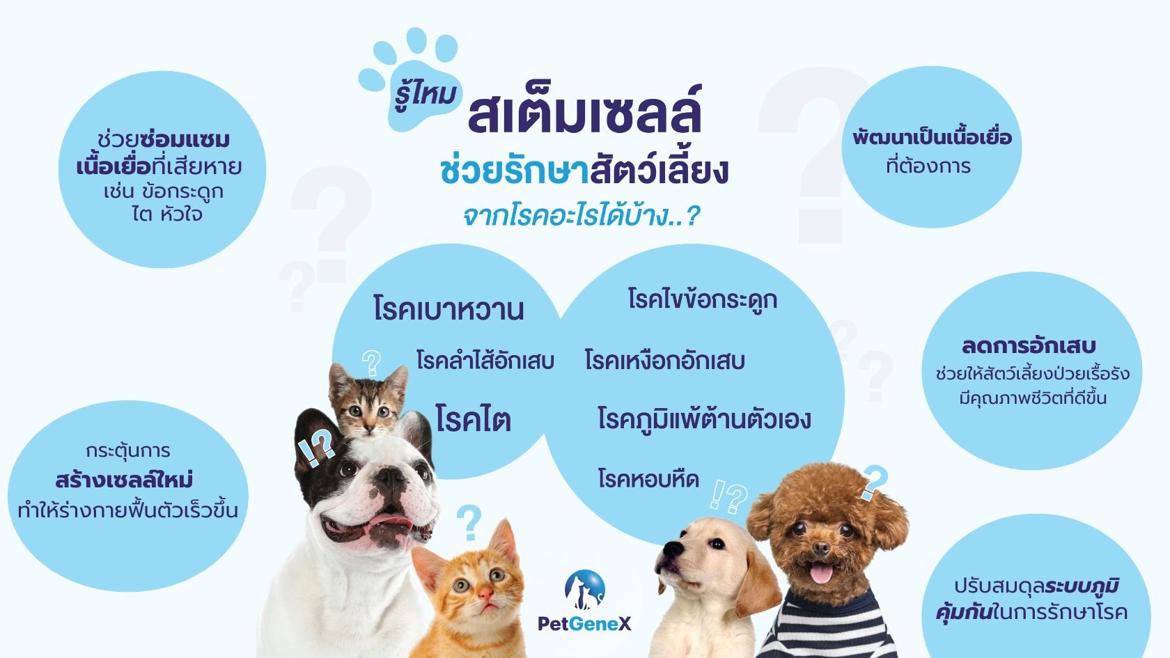 สัตว์เลี้ยงมีอายุขัยสั้นกว่ามนุษย์และเมื่ออายุมากขึ้นความเสื่อมของร่างกายก็เพิ่มขึ้นสเต็มเซลล์สามารถช่วยชะลอความเสื่อมและส่งเสริมสุขภาพที่ดีในระยะยาว