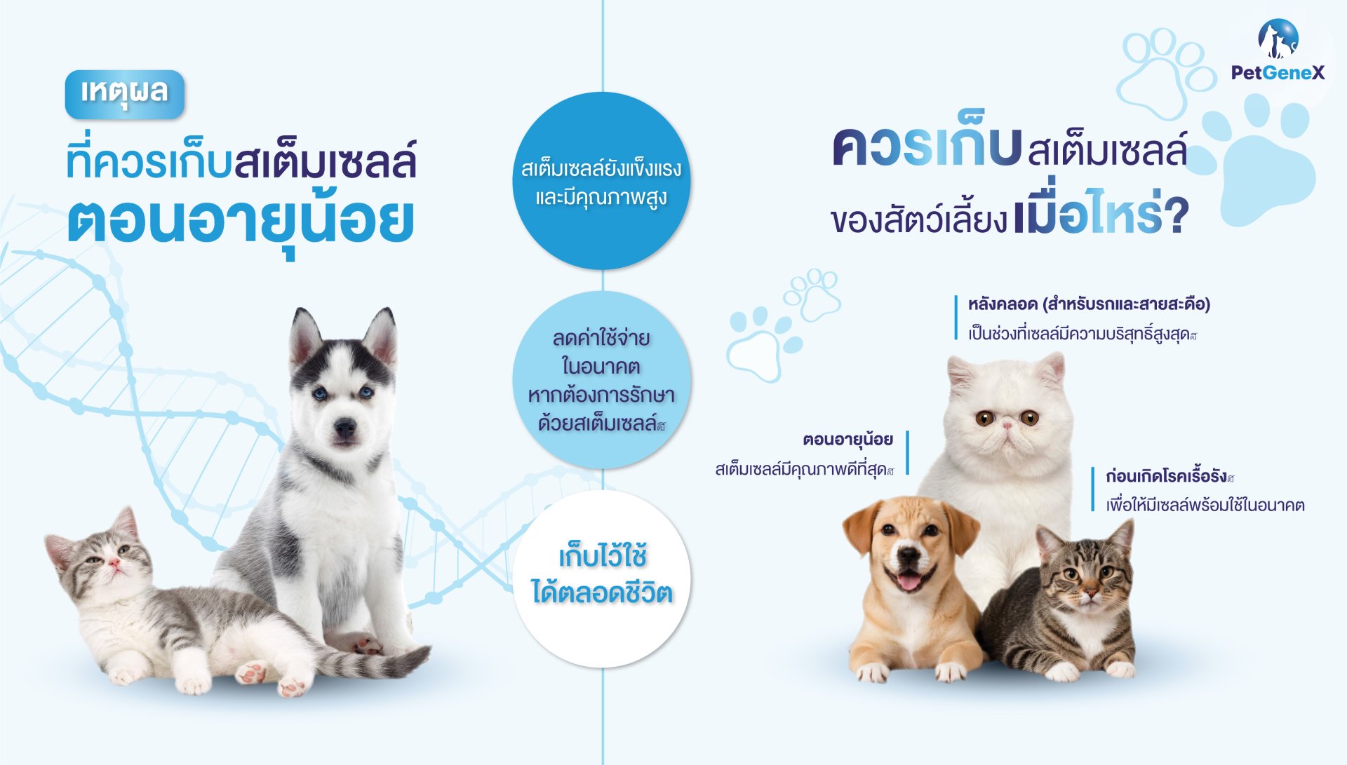 การเก็บสเต็มเซลล์ตั้งแต่น้องหมาน้องแมวยังอายุน้อย ทำให้ได้เซลล์ที่แข็งแรงที่สุดและสามารถนำไปใช้รักษาได้เมื่อต้องการ